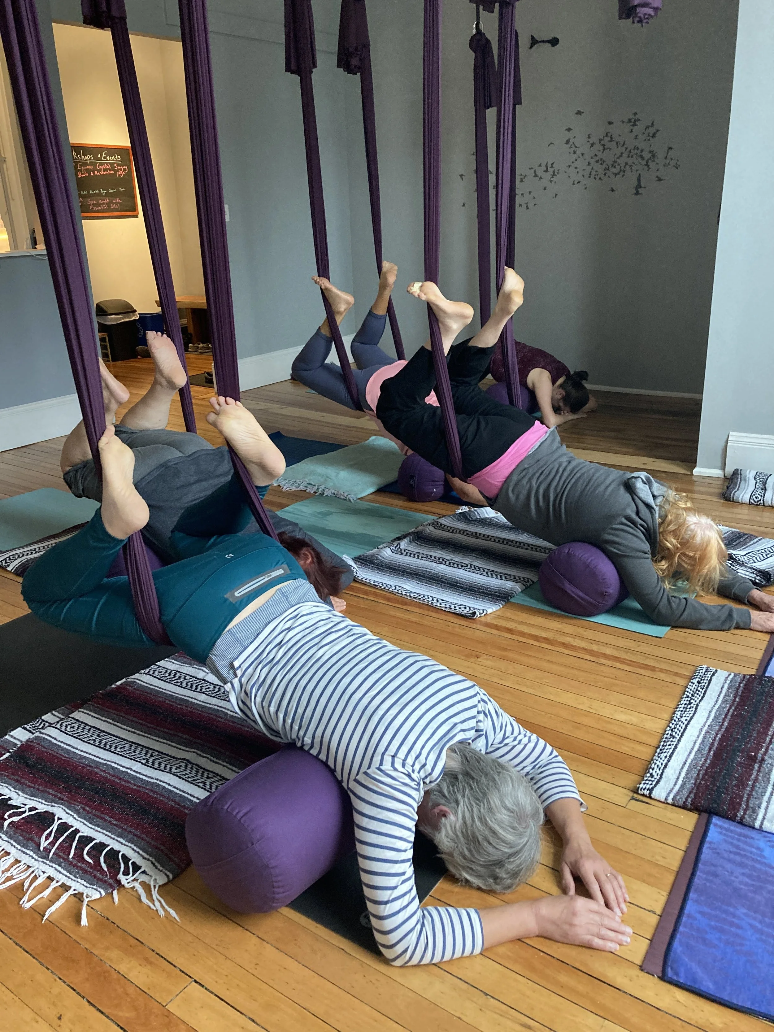 Led by Leah Titcomb, E-RYT, and studio lead teachers, this Aerial Yin Yoga teacher training will provide you with the tools to safely and confidently instruct and share the benefits of Aerial Yin Yoga.