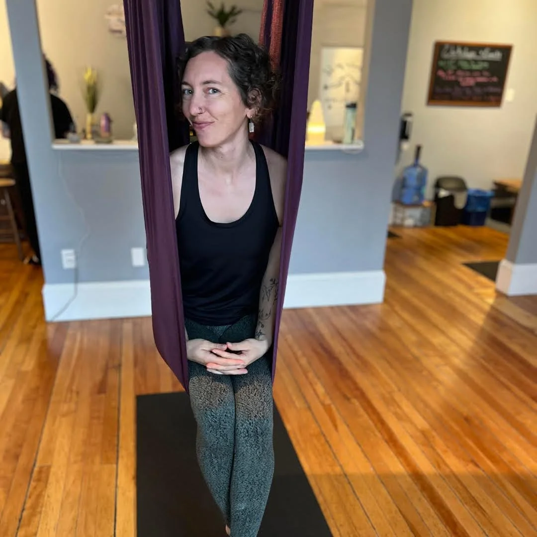 Molly Klein, Certified Yoga Instructor, RYT-200 and Certified Aerial Yoga Teacher. Molly found a love of yoga as a toddler, following along with “the yoga lady” on VHS with her mom. Connecting the breath to the movement of the body has always felt natural and beautiful, and aerial yoga brings in an element of playfulness that Molly believes everyone should have in their lives. Molly loves to spend her time in the space that intersects restorative healing and plain old fashioned fun and has found aerial yoga to be the perfect place to find a balance between these two vitally important and yet fundamentally different things. When not in the yoga studio Molly can be found working with children, fostering their playfulness and curiosity for the world around them.